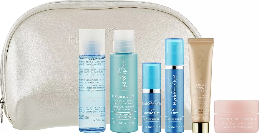 Зручна, містка перламутрова косметичка + 6 незамінних супутників для очищення, сяйва, гладкості, омолодження і захисту від шкідливого сонячного випромінювання. Всі засоби з набору підійдуть для будь-якого типу шкіри, пептиди нового покоління працюють тільки там де це необхідно, підлаштовуючись під індивідуальні потреби, незалежно від віку і стану шкіри.