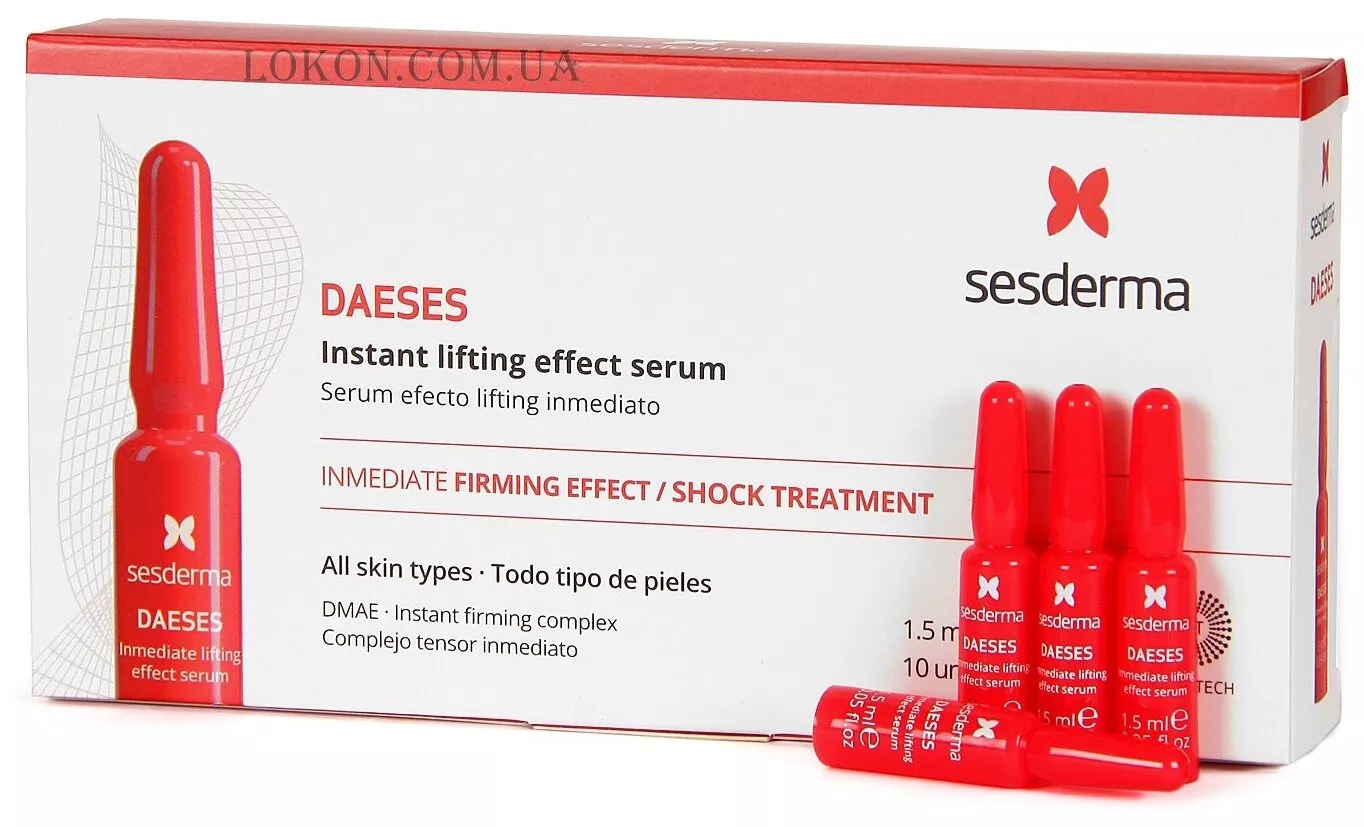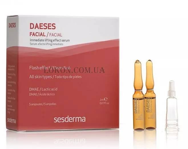 Daeses Serum Lifting Effect від Sesderma надає підтягуючий флеш-ефект. Для всіх типів шкіри. В'яла шкіра, дрібні зморшки, знижений тонус шкіри. Розгладжує і підтягує шкіру. Володіє миттєвим ліфтинговим ефектом. Відразу після нанесення сироватки шкіра підтягується, стає більш еластичною, гладкою і зволоженою.Вона надасть ефективний омолоджуючий ефект.