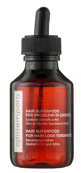 Ефективність Contempora Hair Superfood For Hair Loss Tendencies Densifying Lotion обумовлена його складом. У ньому міститься велика кількість цінних натуральних олій та екстрактів. Одну з головних ролей серед них виконує амла (або індійський аґрус). Вона має чудові зволожувальні та живильні властивості. Амла результативно бореться з випаданням волосся, а також сухістю, перерізом кінчиків та іншими ушкодженнями. Завдяки їй після застосування засобу локони стають м'якими та гладкими.
