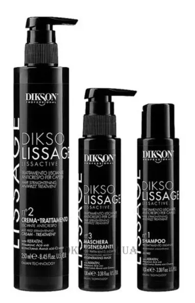 Diksolissage Lissactive Dikson, завдяки своїй неагресивній формулі, є безпечним продуктом для волосся та підходить для будь-якого типу волосся, як натурального, так і обробленого. Результат випрямленого волосся видно вже після першої процедури. ДиксоЛиссаж також регенеруюче впливає волосся, зволожуючи та відновлюючи його.