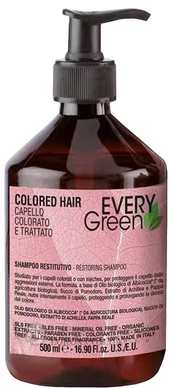 Шампунь для фарбованого та обробленого волосся Dikson Every Green Restoring Shampoo містить такі органічні компоненти, як олія абрикоса, прополіс, томатний сік та екстракт деревію.