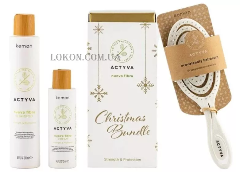 Набір Nuova Fibra, розроблений для міцності та захисту. Він включає шампунь Actyva Nuova Fibra (250 мл), крем Actyva Nuova Fibra (125 мл) та екологічну щітку для розплутування Actyva.