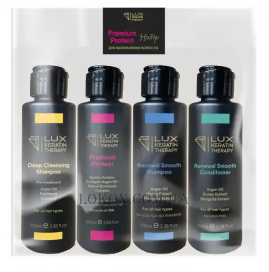 Склад набору: Lux Keratin Therapy Deep Cleansing Shampoo - Шампунь для глибокого очищення волосся 100 мл + Lux Keratin Therapy Premium Protein - Засіб для випрямлення товстого і дуже кучерявого волосся 100 мл + Lux Keratin Therapy Renewal Smooth Shampoo - Шампунь для розгладження волосся 100 мл + Lux Keratin Therapy Renewal Smooth Conditioner - Кондиціонер для розгладження волосся 100 мл.
