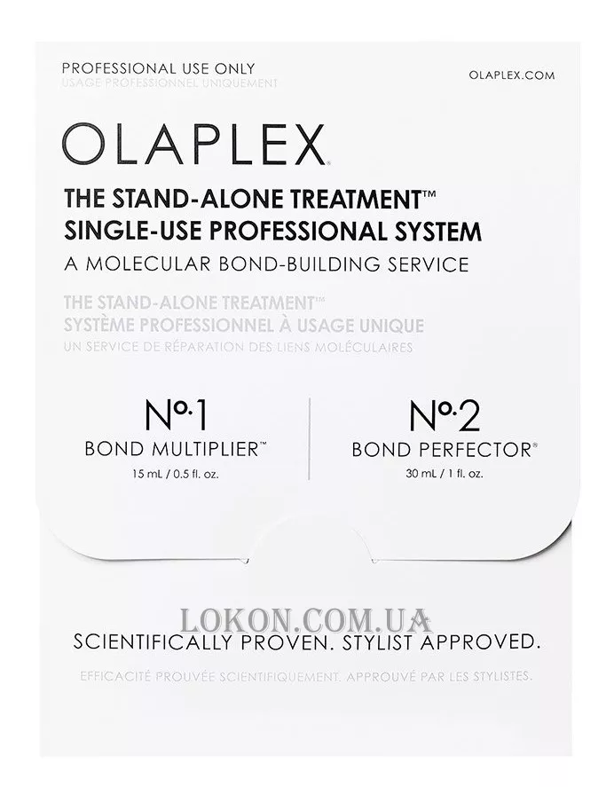 Olaplex № 1 працює на молекулярному рівні для пошуку і відновлення порушених зв'язків у волоссі, викликаних хімічним, термічним і механічним пошкодженням. Його можна використовувати для відновлення пошкодженого волосся або додати до будь-якої служби захисту та зміцнення волосся.