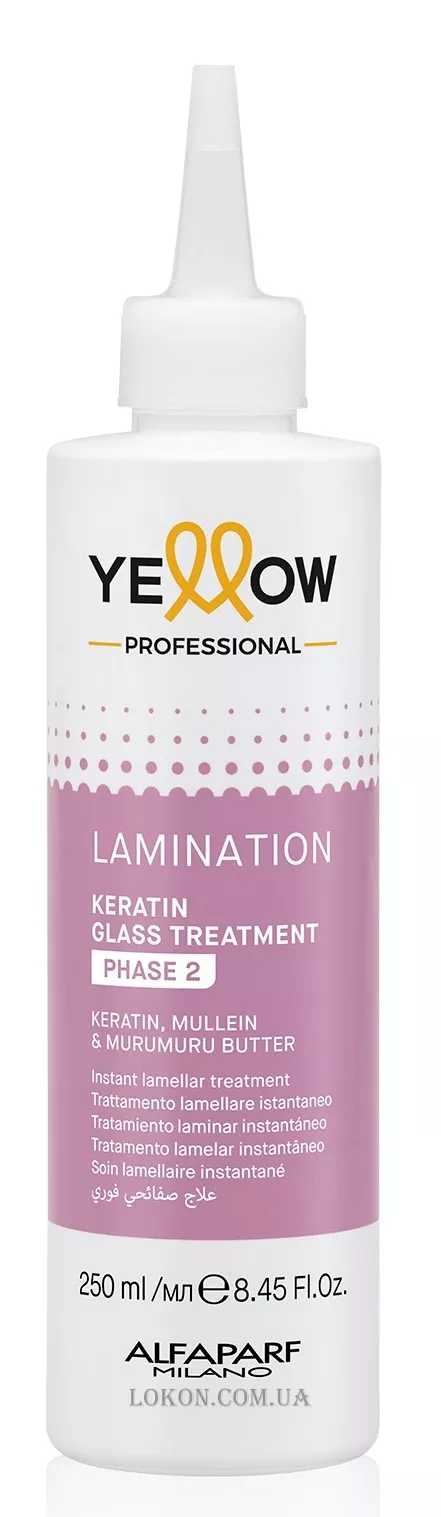 Емульсія призначена для 2 кроку процедури ламінування волосся. Процедура підходить для всіх типів волосся, в тому числі кучерявого. Після процедури волосся блискуче, м'яке і шовковисте, відмінно кондиціоноване, що полегшує розчісування волосся. Засіб застосовується тільки разом з емульсією Yellow Keratin GLASS TREATMENT phase 1.