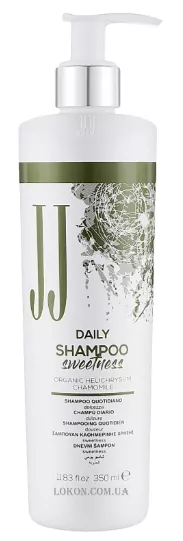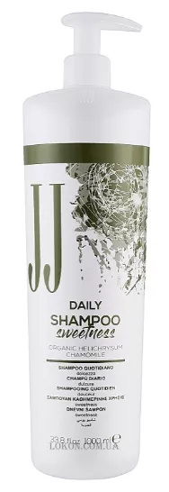 Отличным выбором для ежедневного очищения волос станет деликатный шампунь Sweetness от бренда JJ. Он имеет мягкую моющую основу, которая эффективно справляется с различными загрязнениями, но не нарушает целостность защитной липидной мантии эпидермиса головы. Также средство обогащено органическими экстрактами ромашки и бессмертника. Они положительно влияют на локоны, придавая им жизненную энергию, шелковистость и блеск.