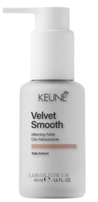 Keune Care Velvet Smooth Silkening Polish - несмываемая кремообразная сыворотка-финиш для сияния, гладкости и защиты волос. Формула создана для укрощения пушистости, защиты от воздействия влаги и добавления блеска. Благодаря термозащите до 230 °C средство идеально подходит для использования с феном или утюжком, но может применяться и без тепловой обработки.